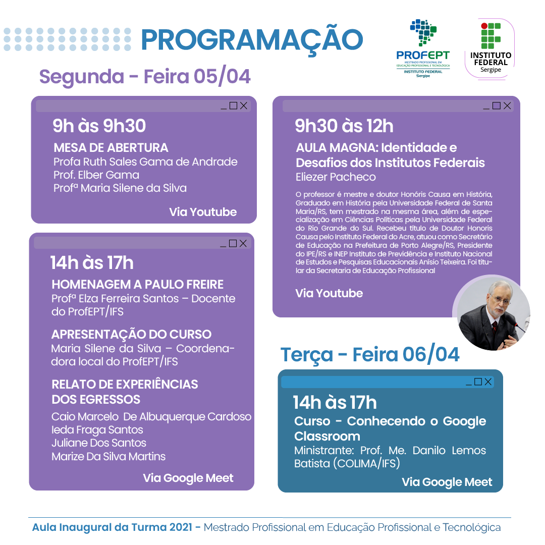 A Coordenação do Mestrado Profissional em Educação Profissional e Tecnológica do Instituto Federal de Sergipe (ProfEPT/IFS) convida os alunos ingressantes em seu Mestrado Profissional para participar da Aula Inaugural da Turma 2021. A iniciativa trata-se de um seminário e será realizada nos dias 05 e 06 de abril, de forma remota, por meio das plataformas Stream Yard, YouTube e Google Meet. Para participar do seminário, os interessados deverão se inscrever por meio do Sistema de Publicações do IFS, o Sispubli, até 04 de abril.