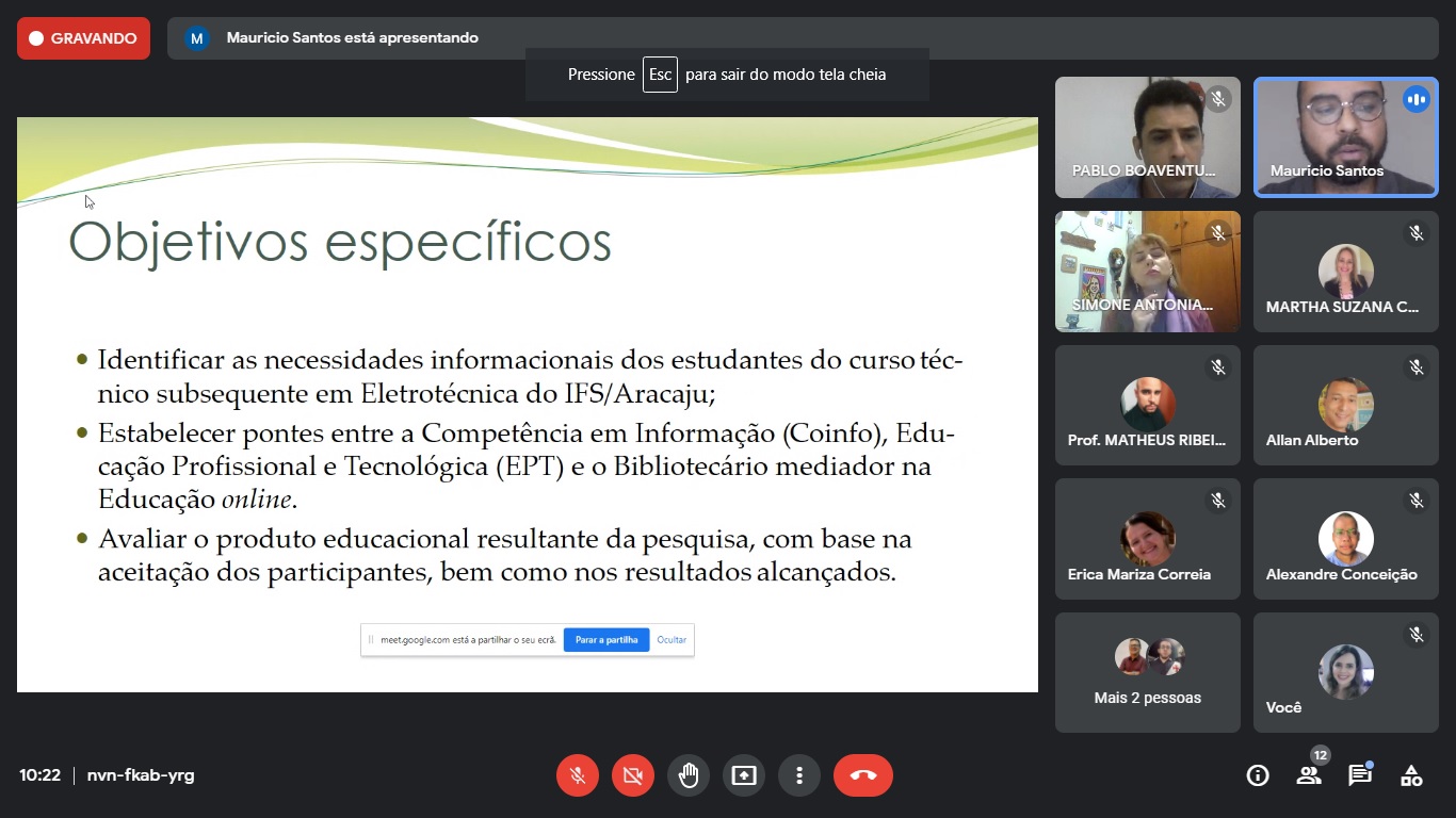 O trabalho de Maurício foi apresentado para uma banca na última quinta, 29, e contou com a presença de professores do Programa de Pós-graduação em Ciência da Informação (PPGCI/UFS), Pablo Boaventura e Martha Suzana Cabral; e da professora Simone Tuzzo, da Universidade Federal de Góias (UFG). A dissertação e o produto final (capacitação) obtiveram nota máxima para os avaliadores, sendo conceituado com um “A”.