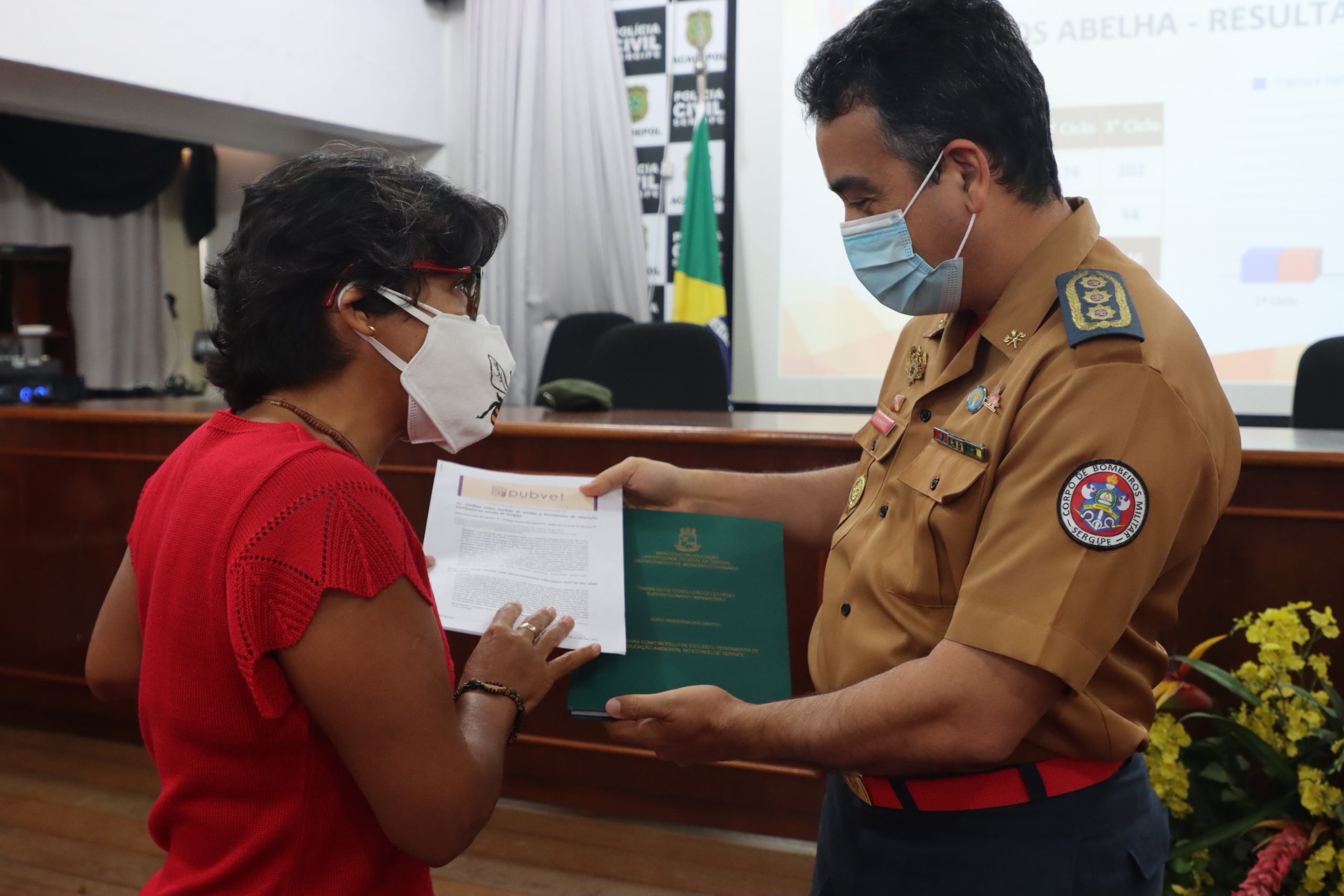 Ao final da solenidade, a estudante de medicina veterinária da UFS, Joyce Inocência, entregou ao subcomandante da corporação, o Trabalho de Conclusão de Curso (TCC) realizado por ela, com o tema “As abelhas como modelo de estudo e ferramenta de educação ambiental no estado de Sergipe”.