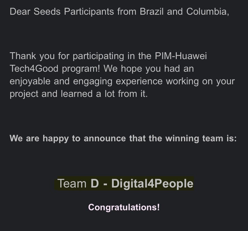 Nas aulas, os alunos foram divididos em grupos para desenvolver o projeto chamado Tech4Good. O objetivo da iniciativa foi resolver um problema social por meio da implementação de tecnologias. A equipe Tech4People, que Renata dos Santos participa, teve o projeto selecionado como o melhor do Brasil e da Colômbia. Além disso, eles passaram para a próxima fase do Programa Seeds for the Future 2021. A empresa Huawei ainda vai passar as informações e orientações sobre os próximos passos para os selecionados.
