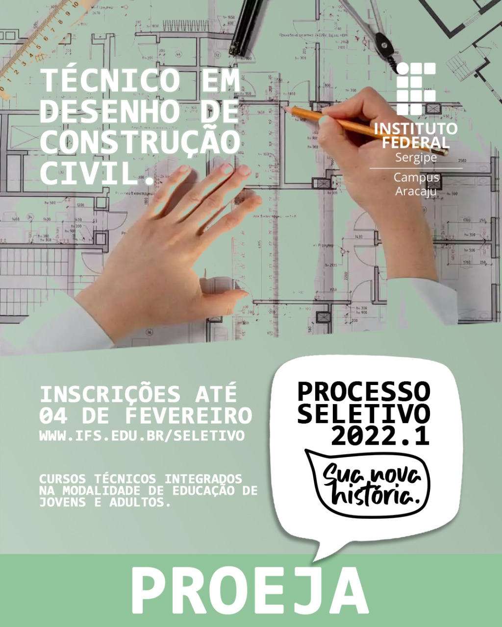 O ano de 2022 já começou a todo vapor no Instituto Federal de Sergipe (IFS). Nesta segunda, 03, foi lançado o edital para o preenchimento de 80 vagas para cursos técnicos de nível médio integrado na modalidade de Educação de Jovens e Adultos (Proeja) para ingresso no 1º semestre deste ano. Nesta seleção, estão sendo ofertadas 40 vagas para o curso de Desenho de Construção Civil, no Campus Aracaju; e 40 para o curso de Comércio, no Campus Itabaiana.