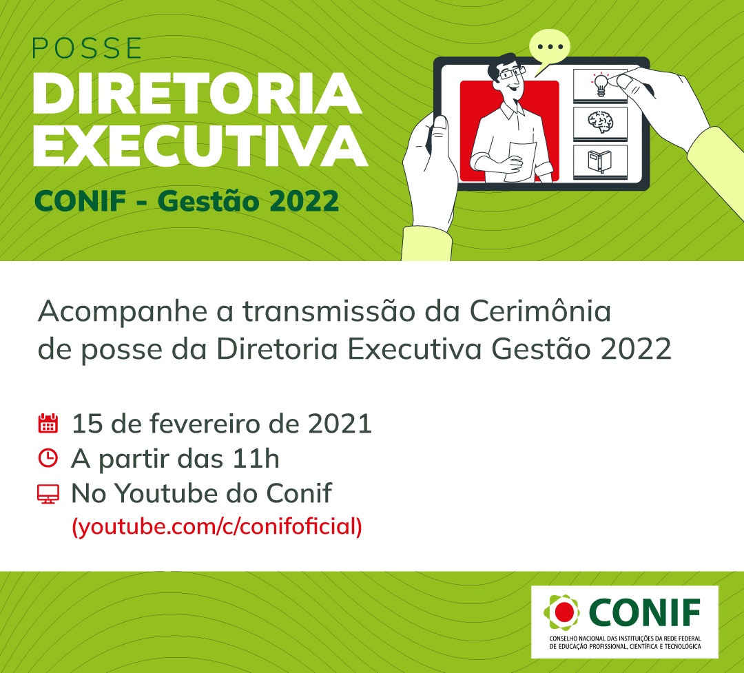 A Diretoria Executiva do Conselho Nacional das Instituições da Rede Federal de Educação Profissional, Científica e Tecnológica (Conif), eleita para a gestão 2022, será empossada no dia 15 de fevereiro, às 11h. A solenidade será virtual e transmitida para toda a comunidade acadêmica da Rede Federal pelo canal do Conif no YouTube.