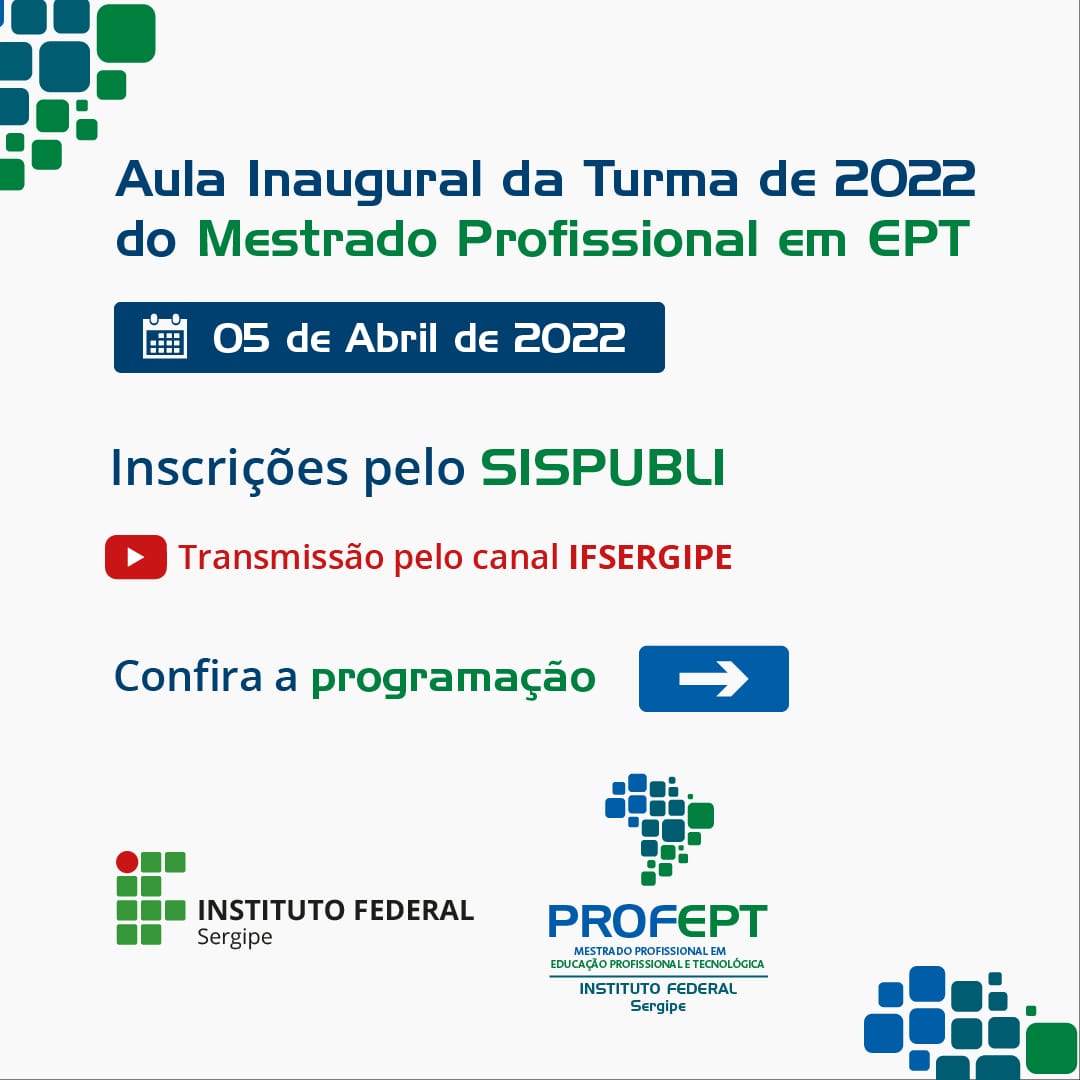 A Coordenação do Mestrado Profissional em Educação Profissional e Tecnológica (EPT), do Instituto Federal de Sergipe (IFS), convida alunos ingressantes, docentes e toda a comunidade em geral para a Aula Inaugural, que ocorrerá em 05 de abril, às 9h, no canal oficial do Instituto no YouTube. Para participar, os interessados devem se inscrever previamente por meio do Sistema de Publicações do IFS, o SisPubli.